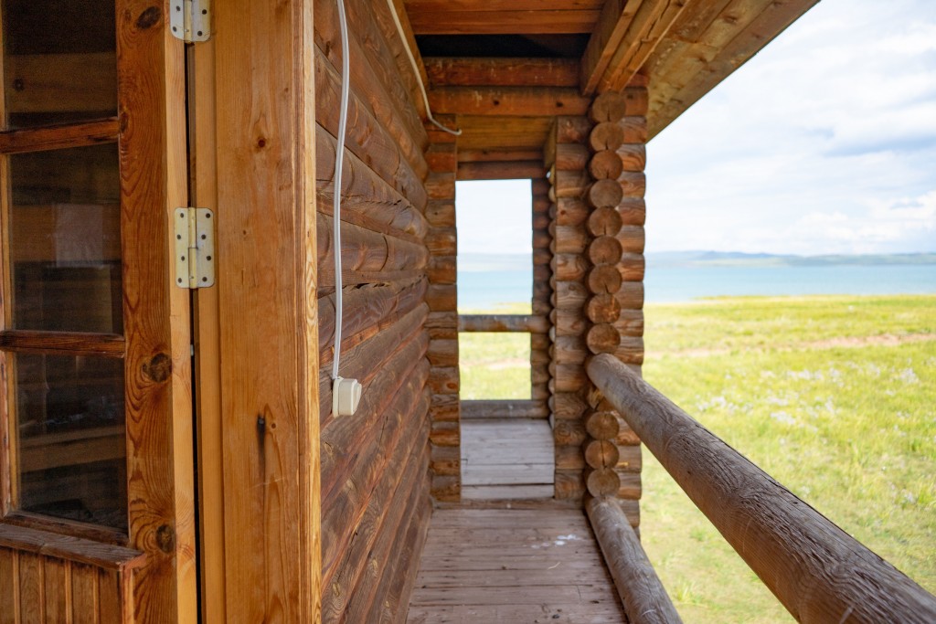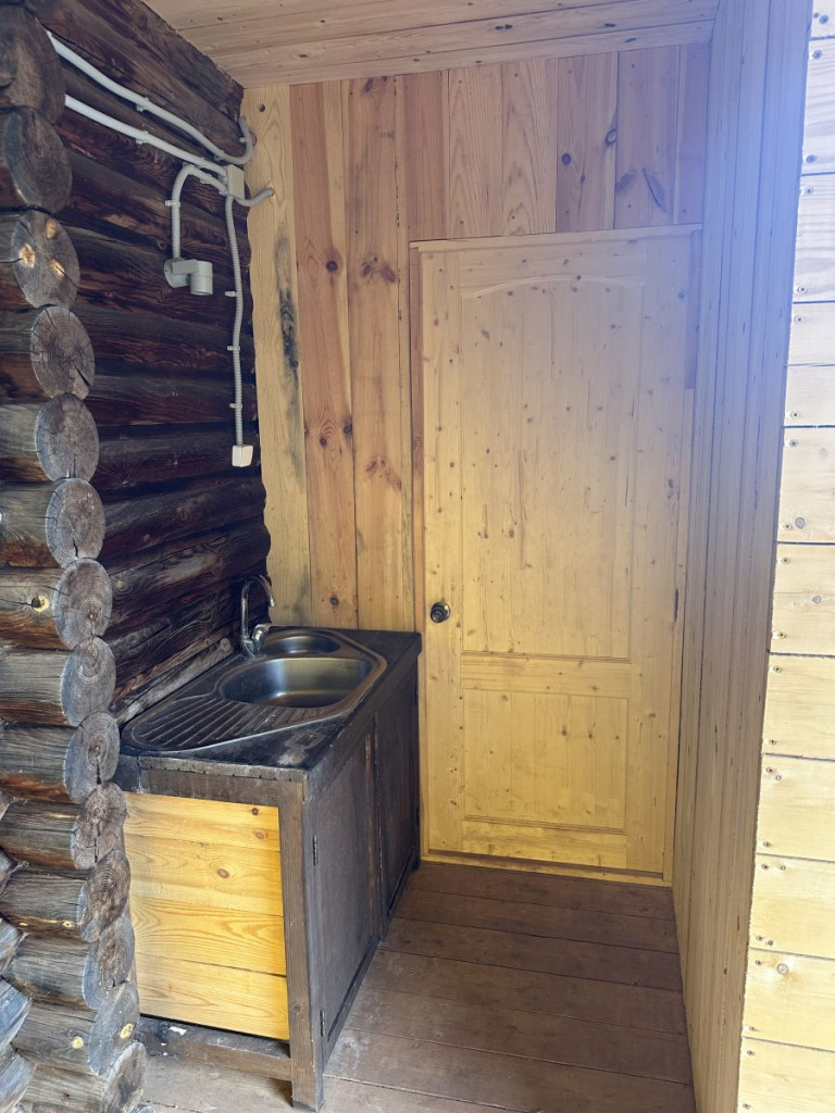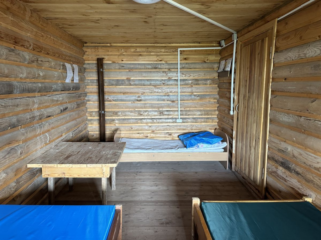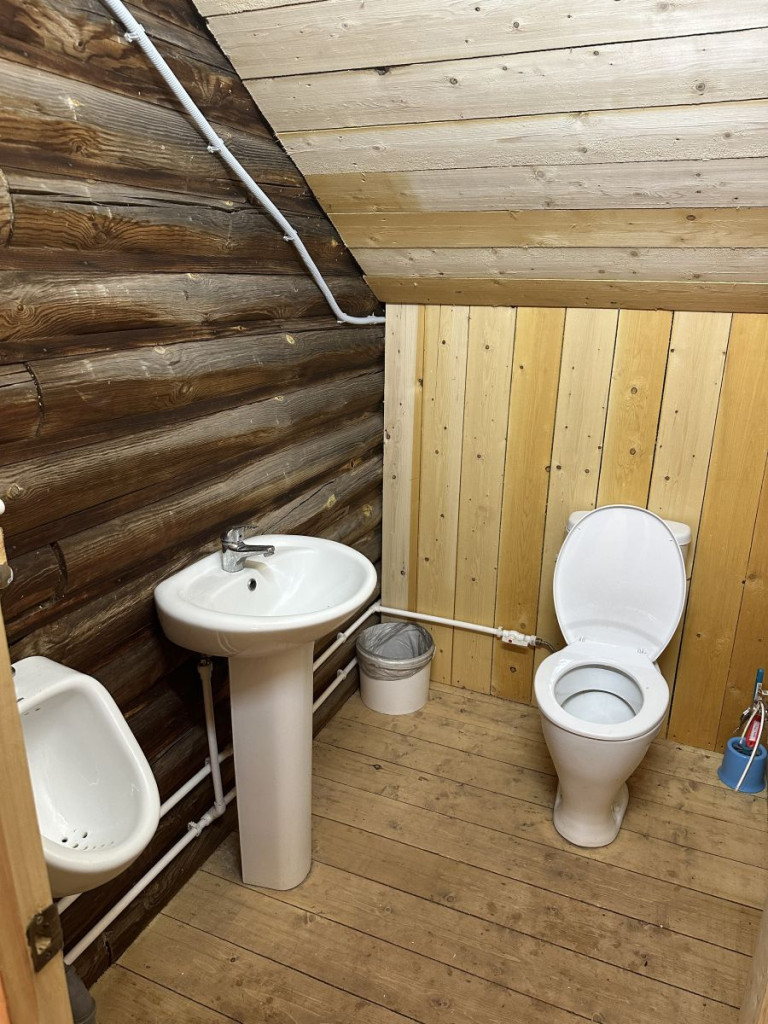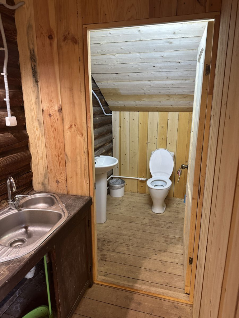 В домике - электричество, холодильник, чайник, собственные туалеты и горячие души. Рядом установлен мангал.