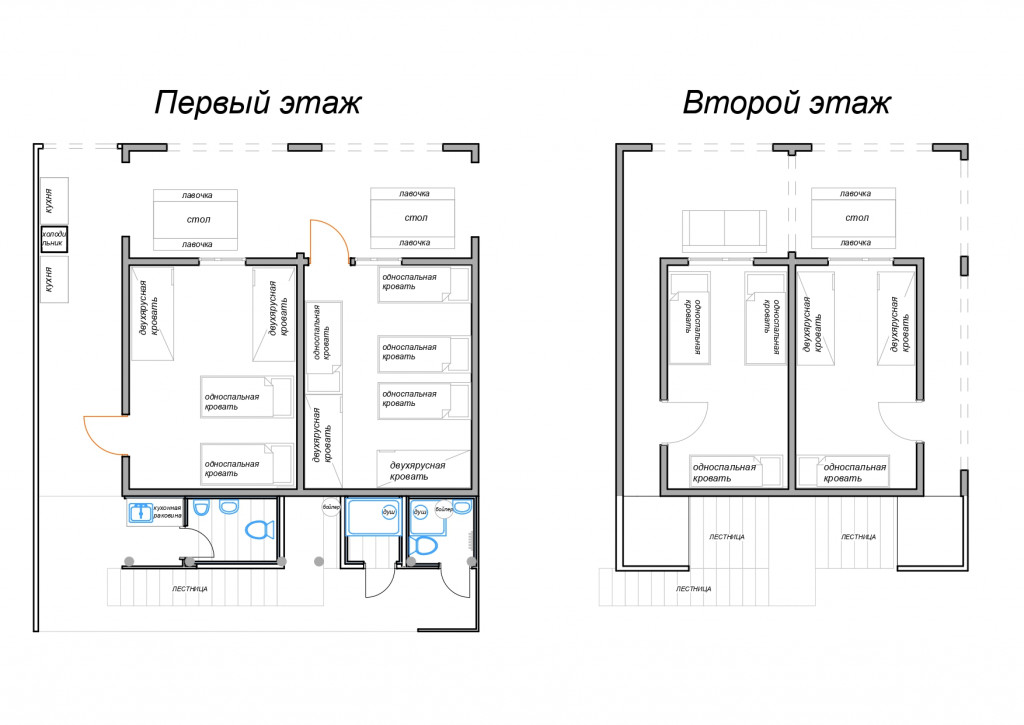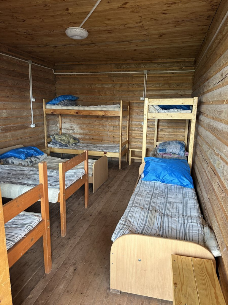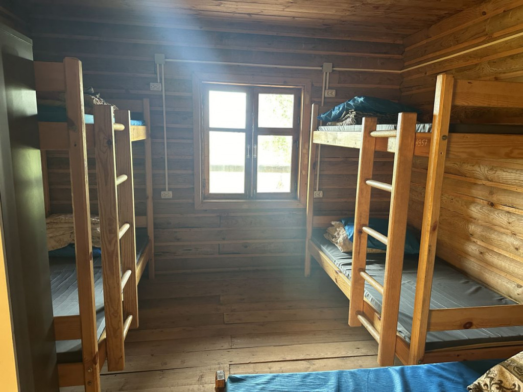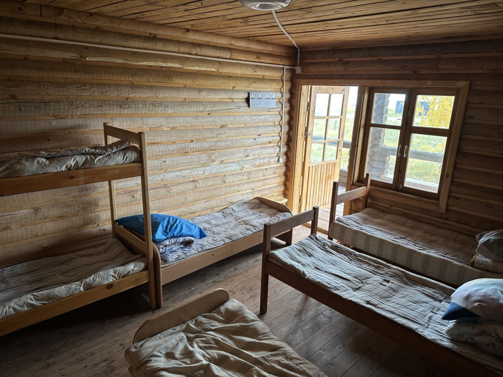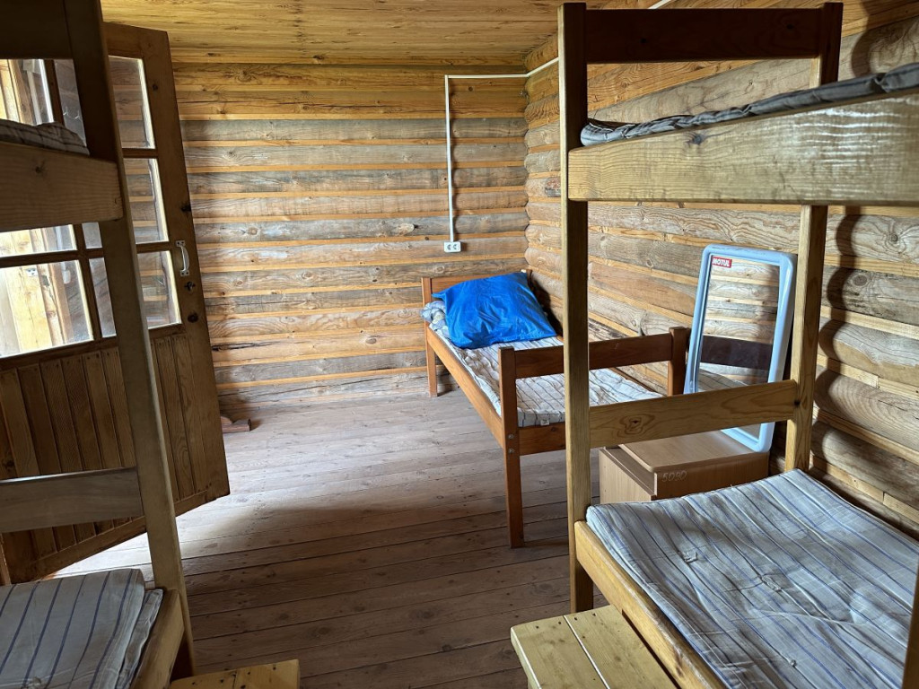 В 1 комнате на первом этаже 6 спальных места: 2 двухъярусные и 2 односпальные кровати. Во 2 комнате на первом этаже 8 спальных мест: 2 двухъярусные и 4 односпальные кровати.