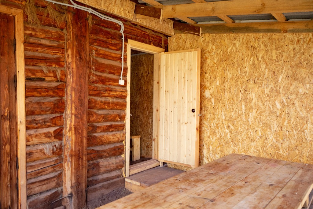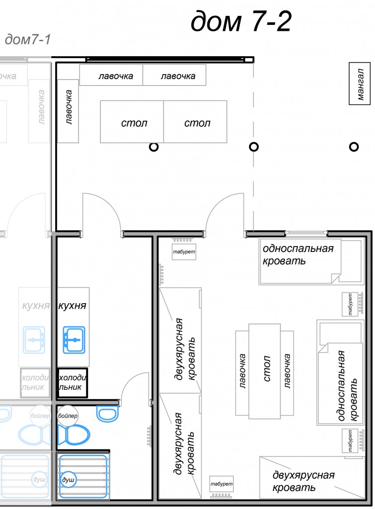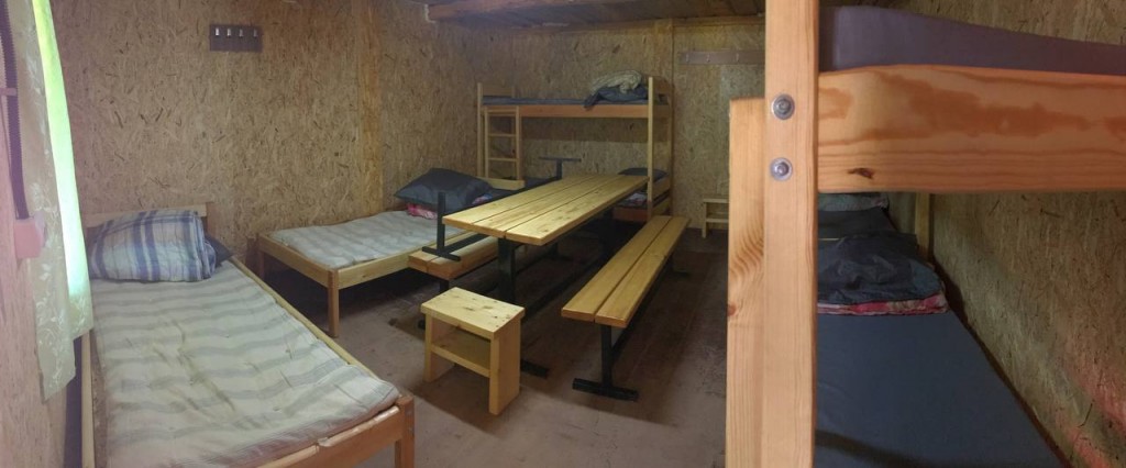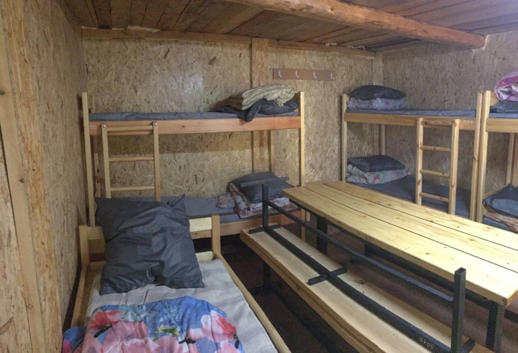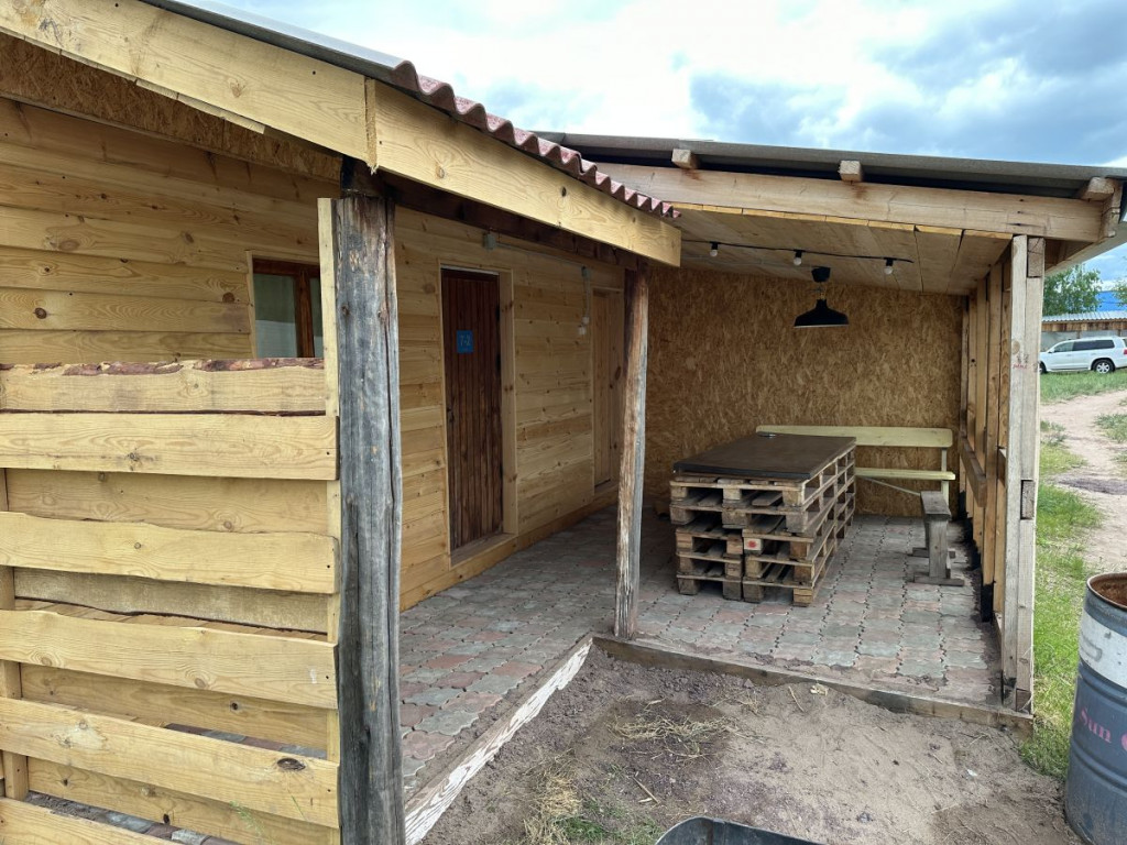 Спальная комната площадью 19 кв.м.: 3 двухъярусные и 2 односпальные кровати. Помещение для кухни и отдельная веранда общей площадью 18 кв.м. Обеденная зона на веранде и внутри домика.