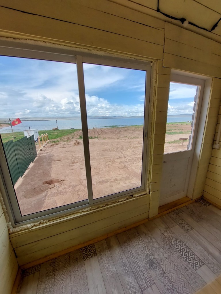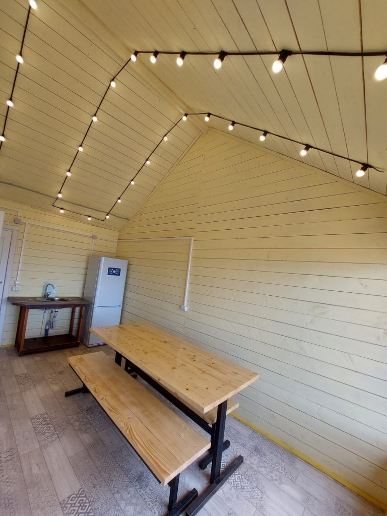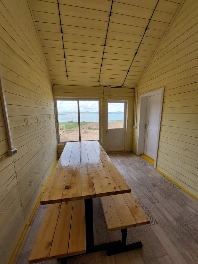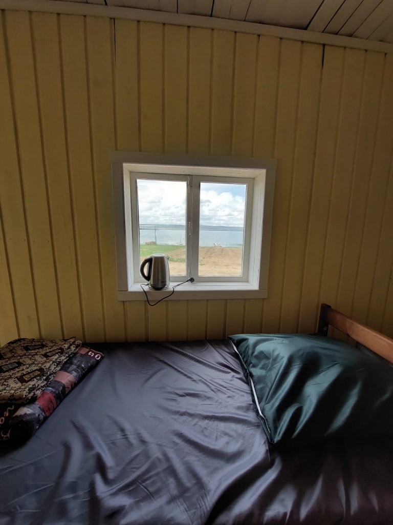 8 местный домик с видом на озеро, первая береговая линия, 70 м до озера. В домике - электричество, холодильник, чайник, собственный туалет и горячий душ. Рядом установлен мангал.