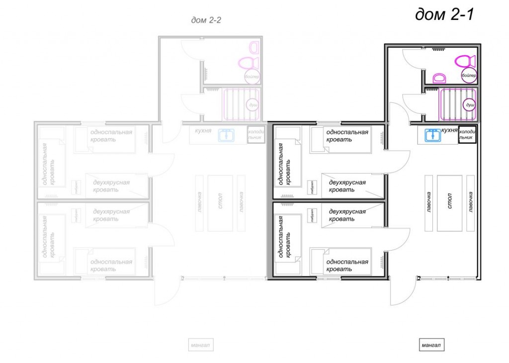 2 спальные комнаты общей площадью 17 кв.м.: 2 односпальных и 1 двухъярусная кровати (4 спальных места) в каждой комнате. Собственная кухня-веранда площадью 14 кв.м.
