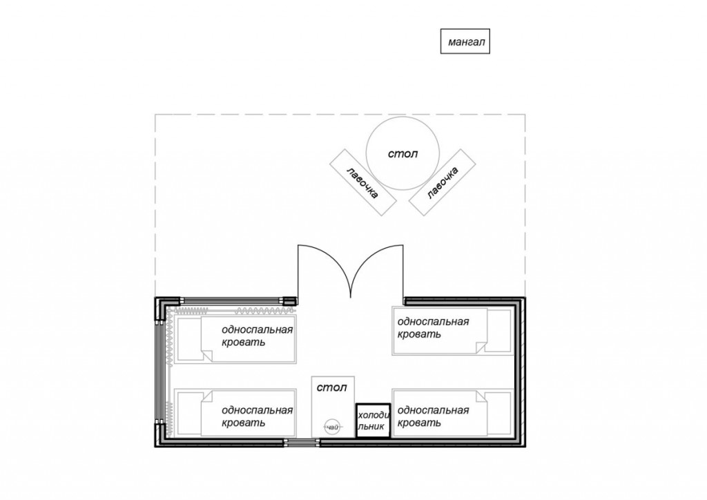 Спальная комната площадью 13 кв.м.: 4 односпальные кровати, конструкция которых позволяет превратить их в 2 двуспальные кровати. Обеденная зона на улице и внутри домика. Крытый навес перед домиком площадью 18 кв.м.