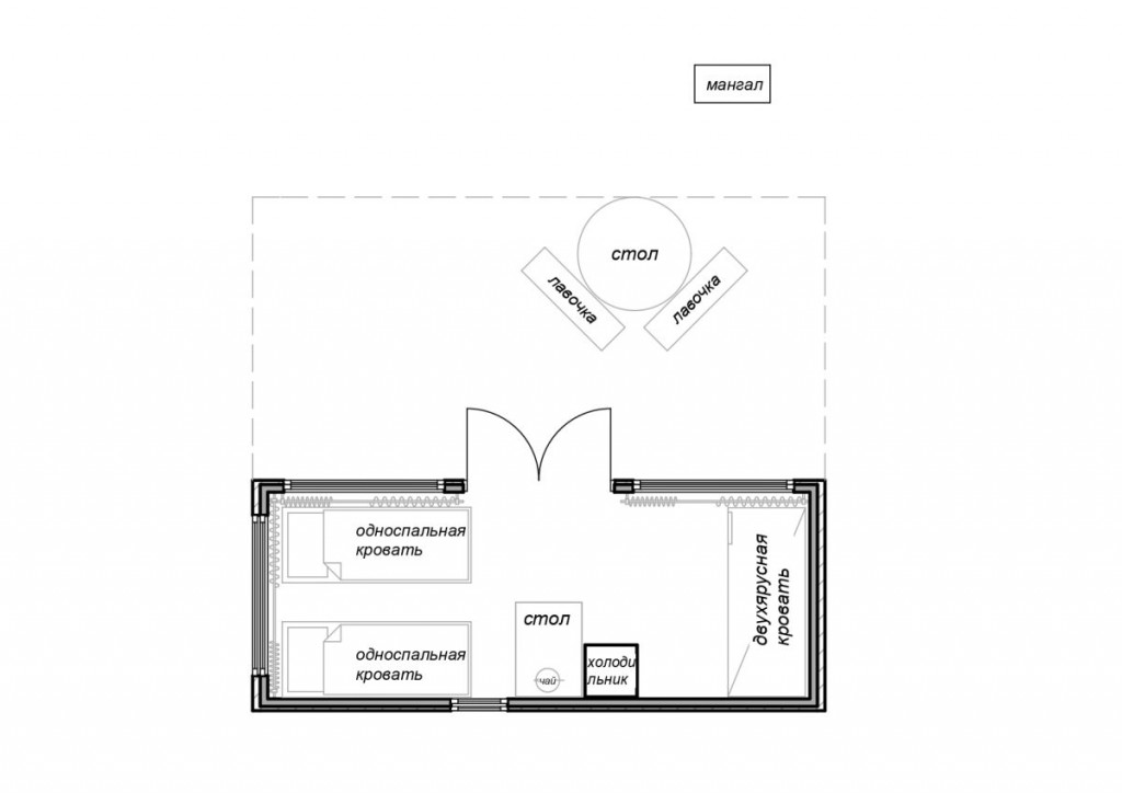 Спальная комната площадью 13 кв.м.: 2 односпальные кровати, конструкция которых позволяет превратить их в 1 двуспальную кровать, а также 1 двухъярусная кровать. Обеденная зона на улице и внутри домика. Крытый навес перед домиком площадью 18 кв.м.