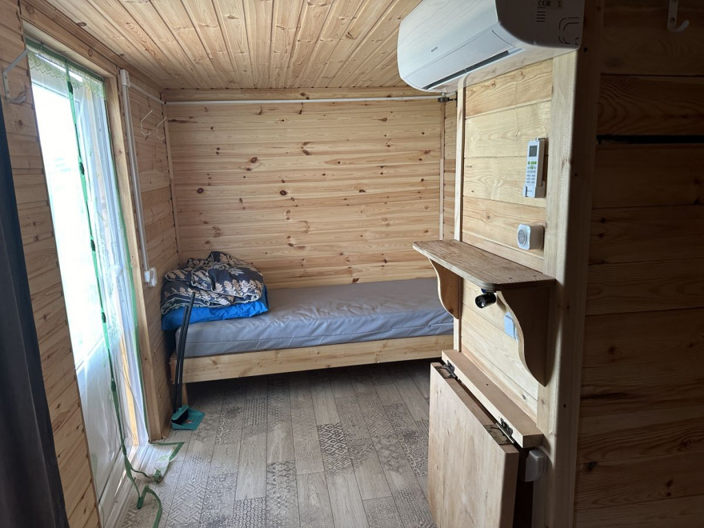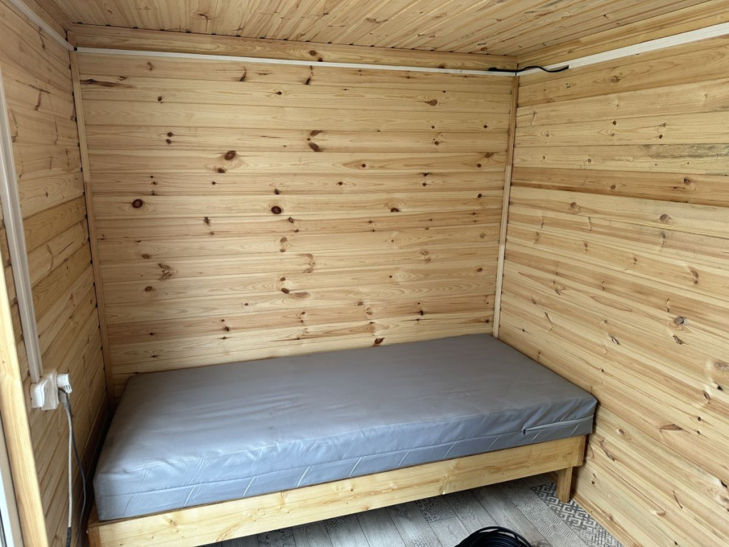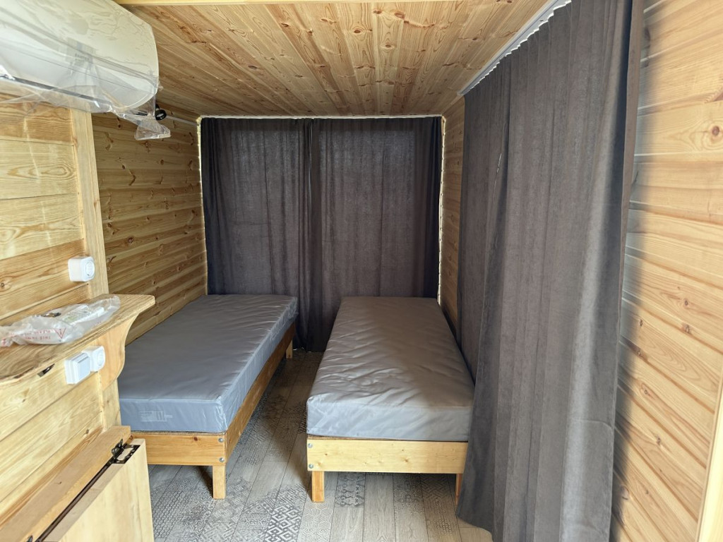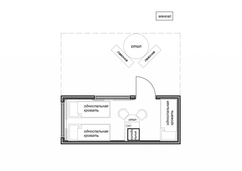 Спальная комната площадью 11 кв.м.: 2 односпальные кровати, конструкция которых позволяет превратить их в 1 двуспальную кровать, а также еще 1 односпальная кровать. Обеденная зона на улице и внутри домика. Крытый навес перед домиком площадью 15 кв.м.
