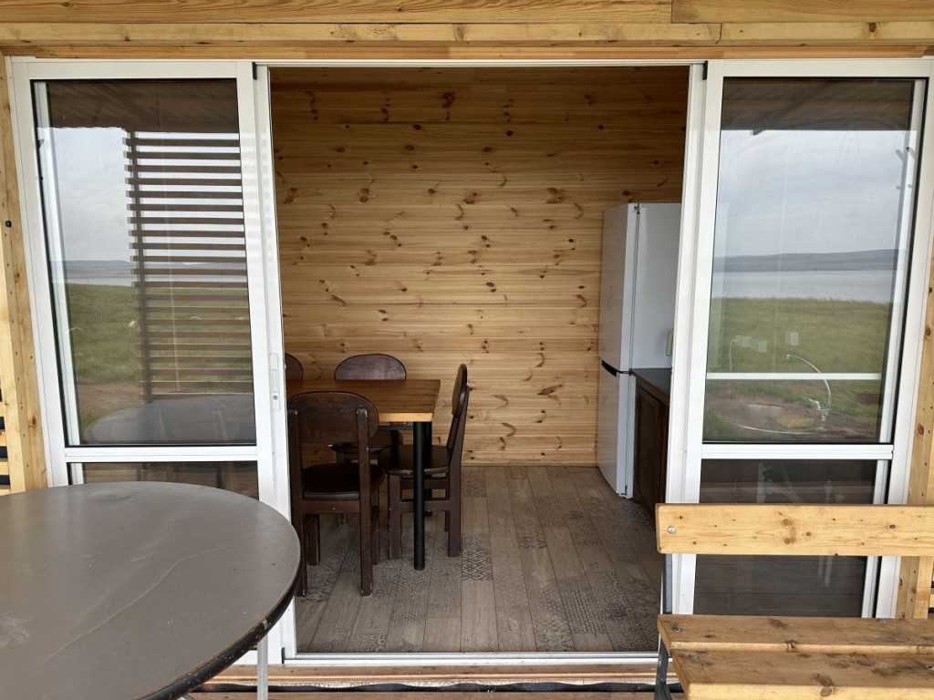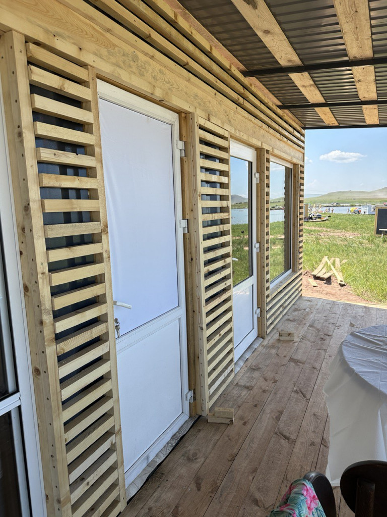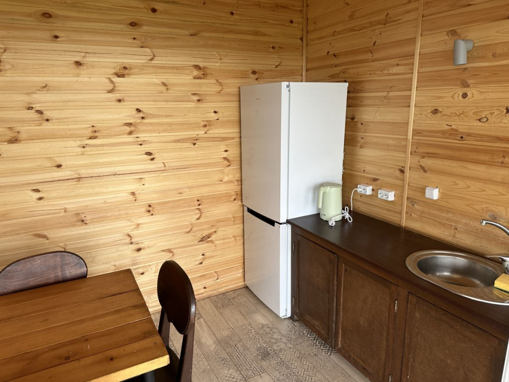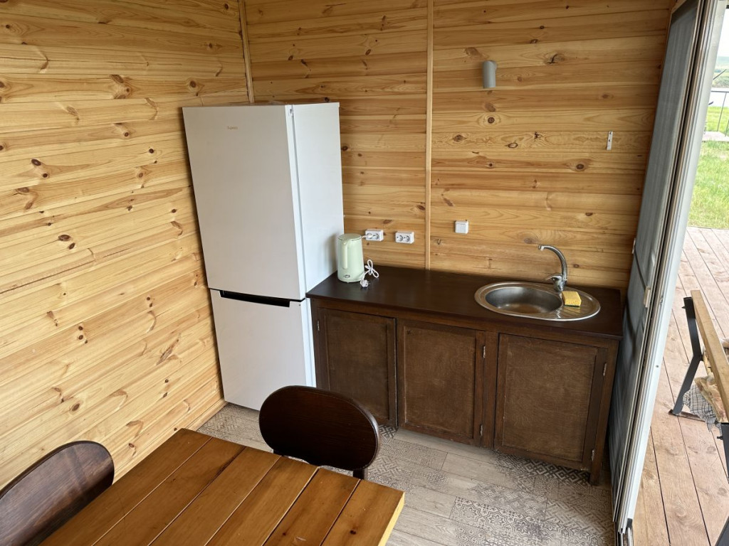 В домике - электричество, холодильник, чайник, собственный туалет и горячий душ. Перед домиком смонтирована деревянная площадка и навес. Рядом установлен мангал.