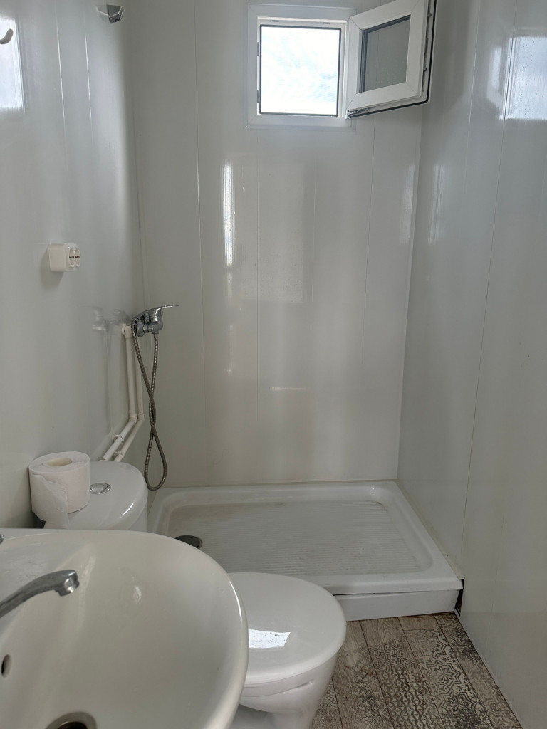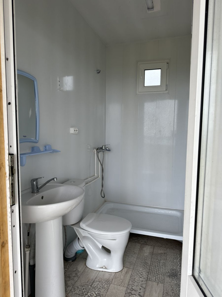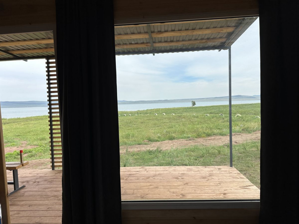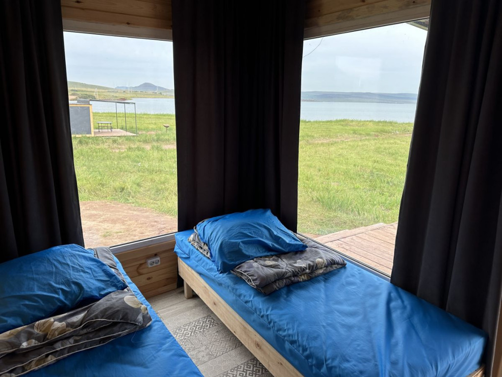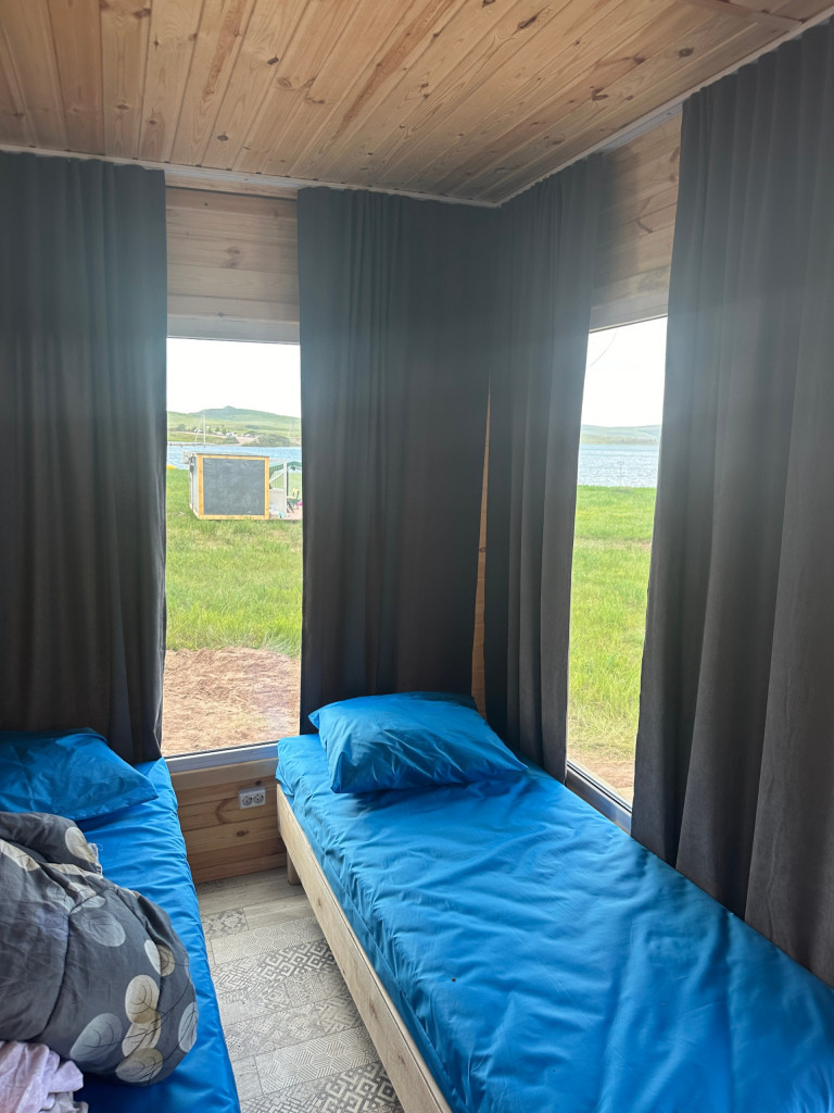 В домике - электричество, холодильник, чайник, собственный туалет и горячий душ. Перед домиком смонтирована деревянная площадка и навес. Рядом установлен мангал.