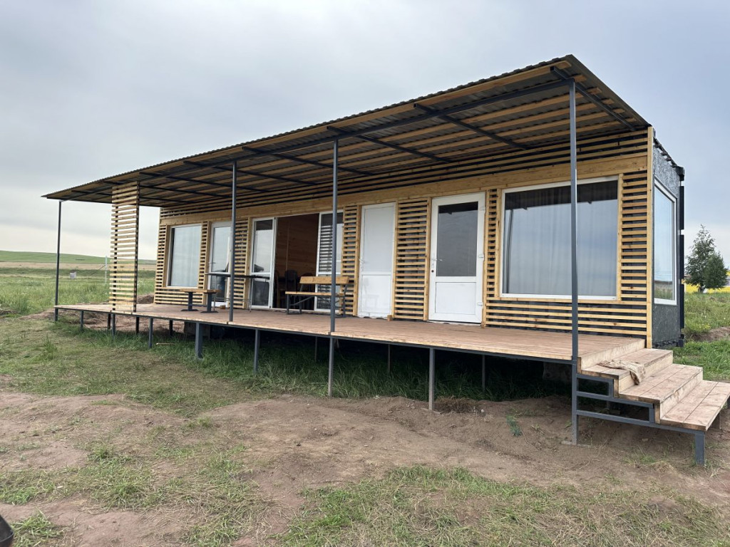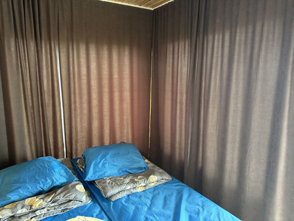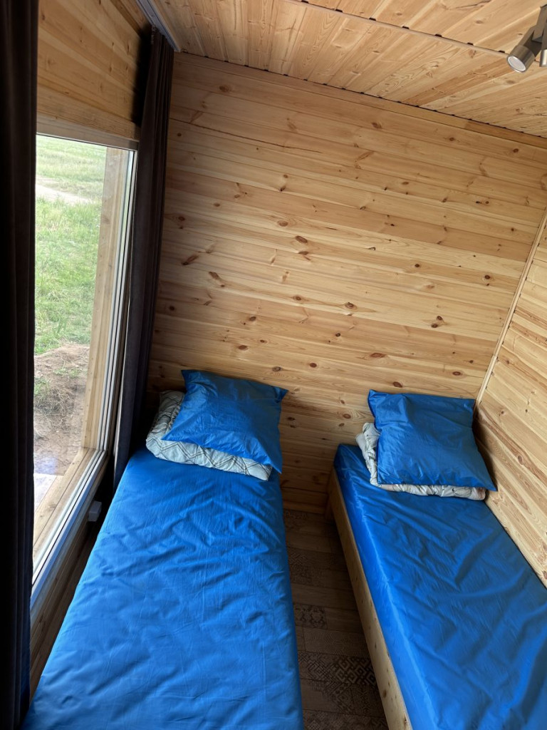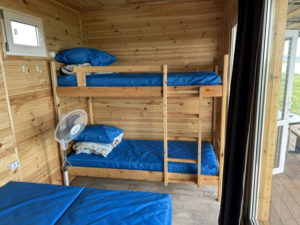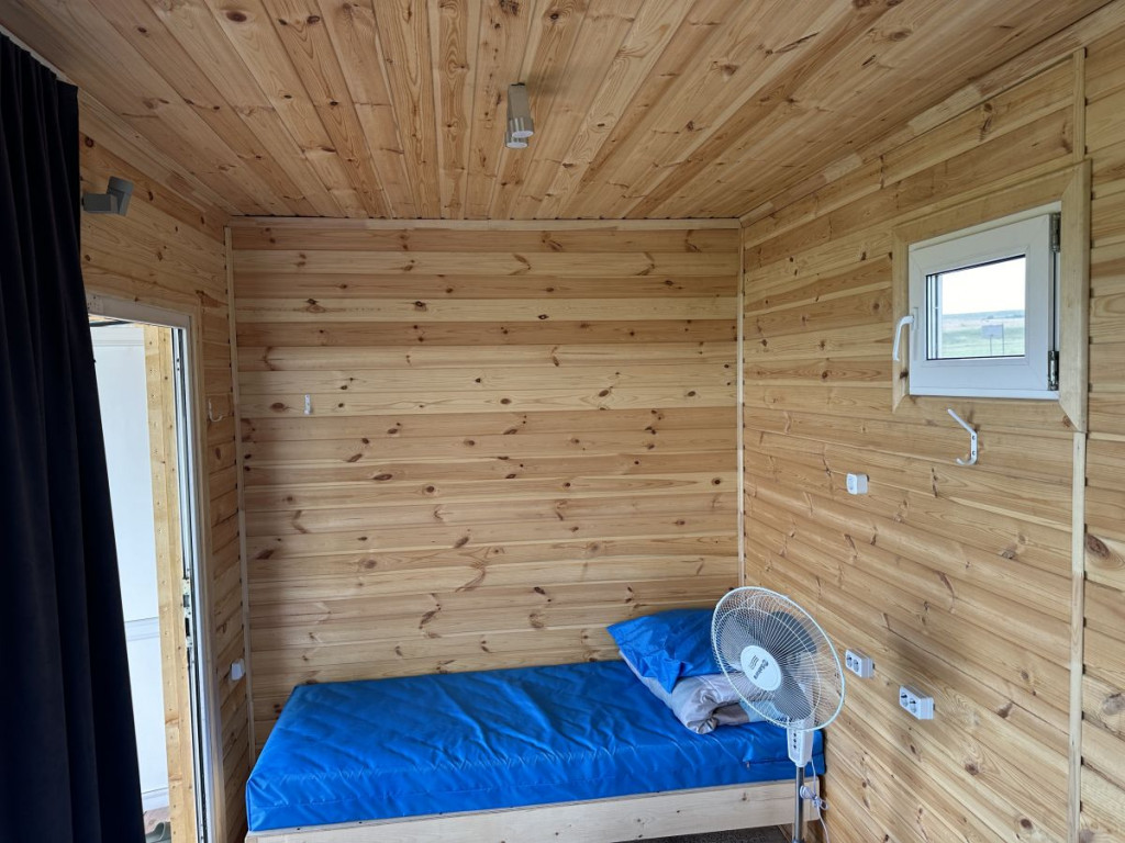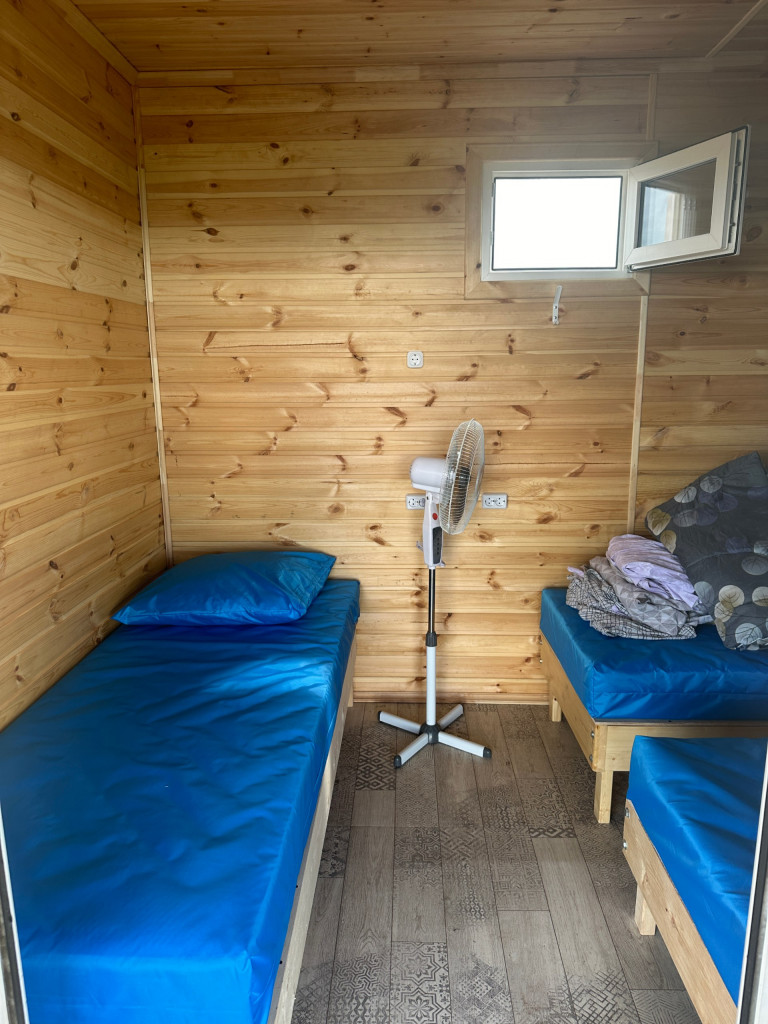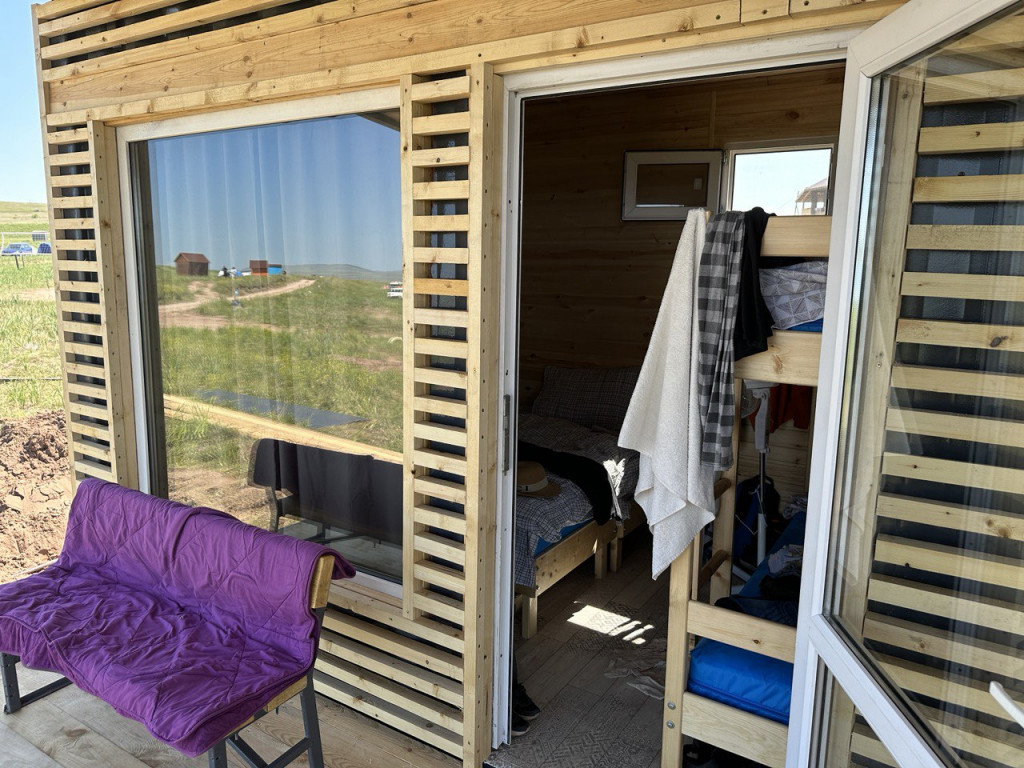 2 спальные комнаты общей площадью 14 кв.м. В первой комнате 3 односпальные кровати, две из которых можно превратить в 1 двуспальную кровать. Во второй комнате 2 односпальные кровати, конструкция которых позволяет превратить их в 1 двуспальную кровать, а также 1 двухъярусная кровать. Собственная кухня-веранда площадью 7 кв.м. Крытый навес перед домиком площадью 30 кв.м.
