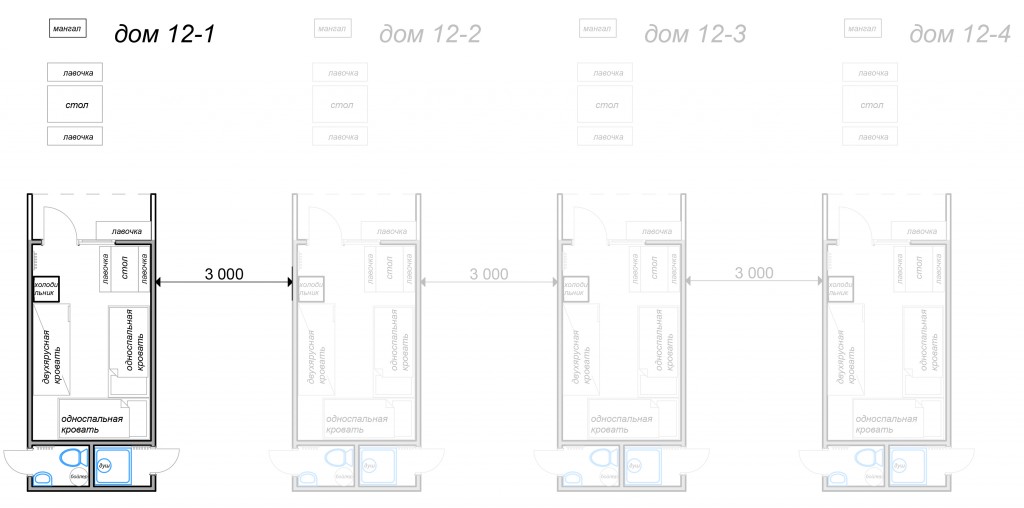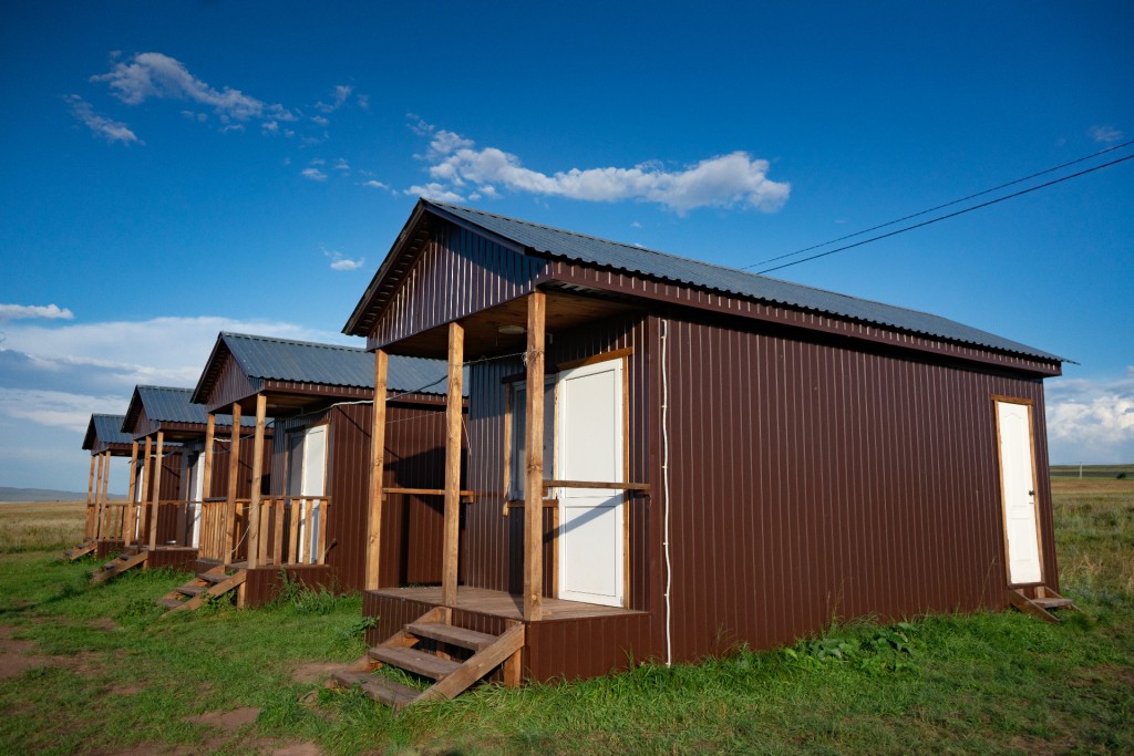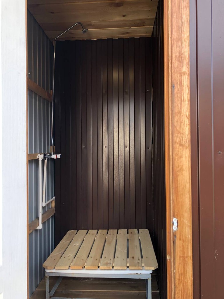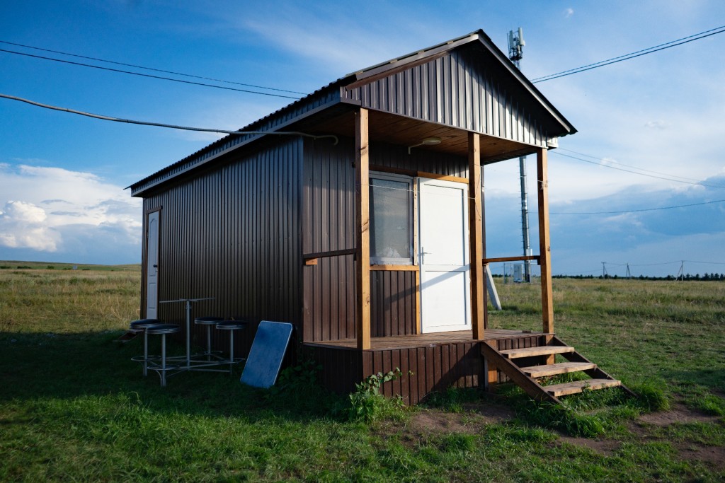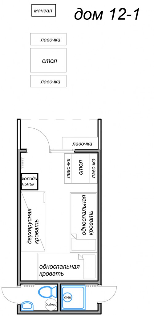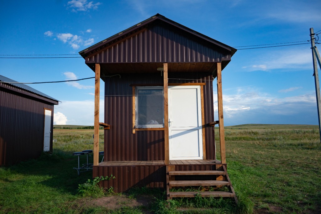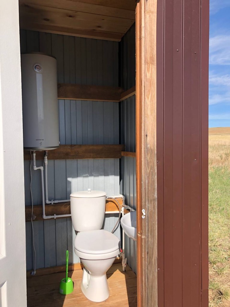 В домике - электричество, холодильник, чайник, собственный туалет и горячий душ. Рядом установлен мангал. Обеденная зона на улице и внутри домика.