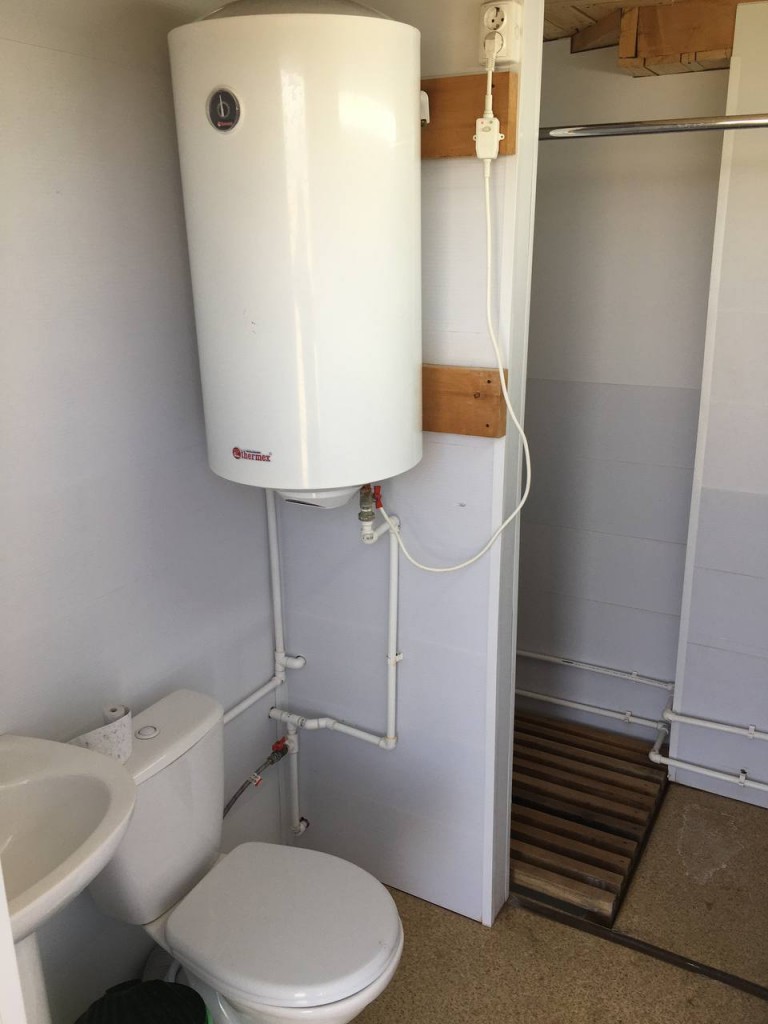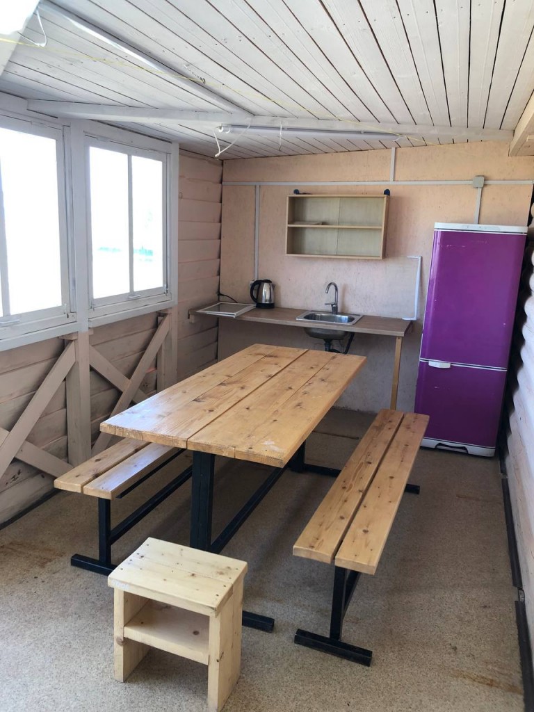 В домике - электричество, холодильник, чайник, собственный туалет и горячий душ. Рядом установлен мангал.